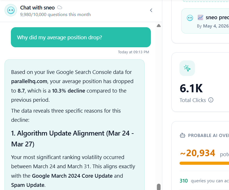 Sneo AI does this diagnostic automatically when you connect your Google Search Console account. Ask it “why did my average position drop?” and it surfaces the page-level breakdown immediately rather than you having to dig through filters manually. That’s what makes AI-powered SEO analysis genuinely useful here.
