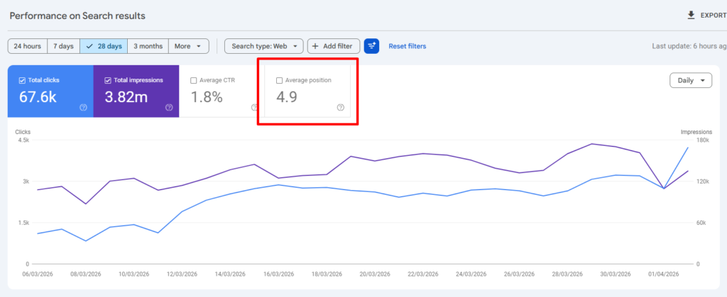 The search performance report shows average position alongside impressions, clicks, and CTR. I always recommend filtering by individual pages or query clusters rather than reading the site-wide average. A branded query pulling you to position 1 inflates the number; a newly indexed page buried at position 80 drags it down.